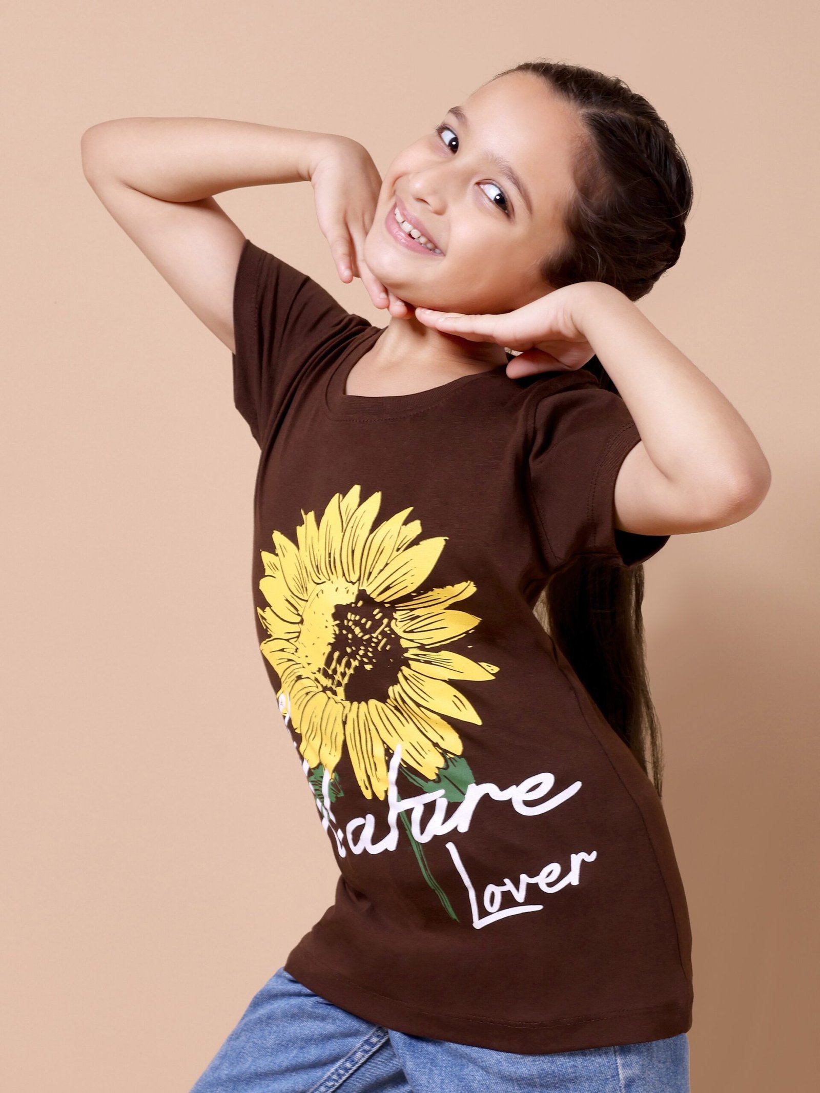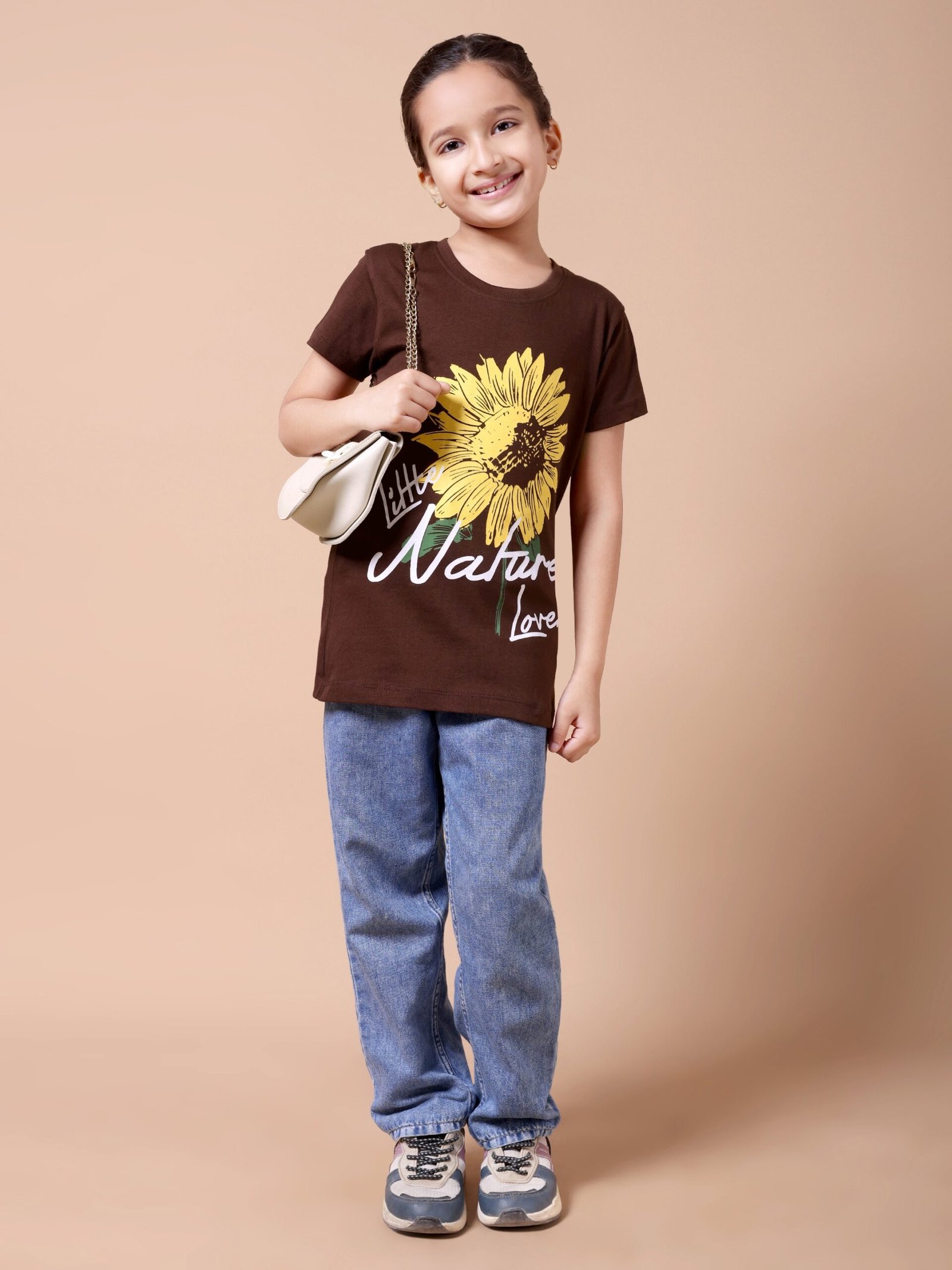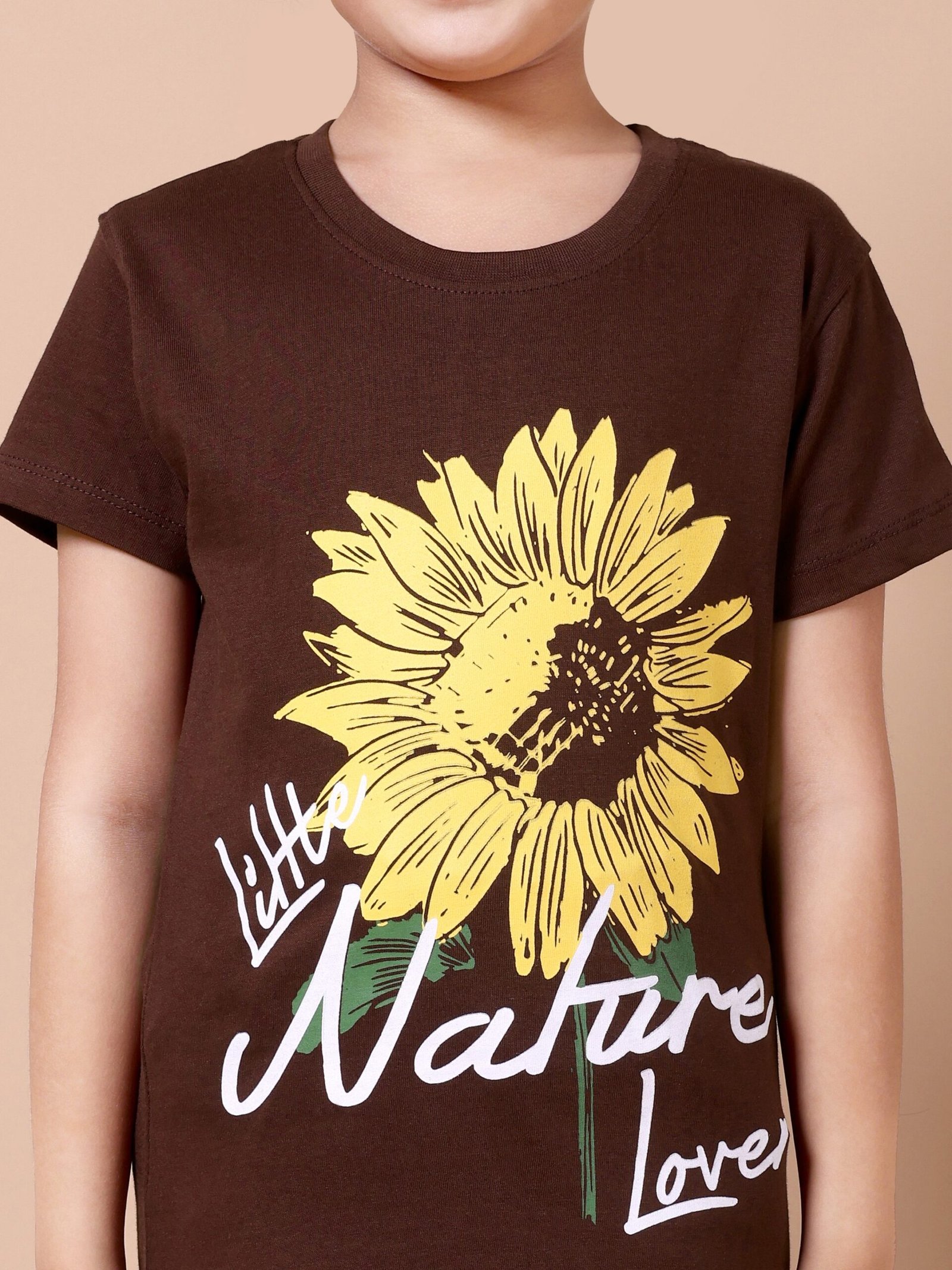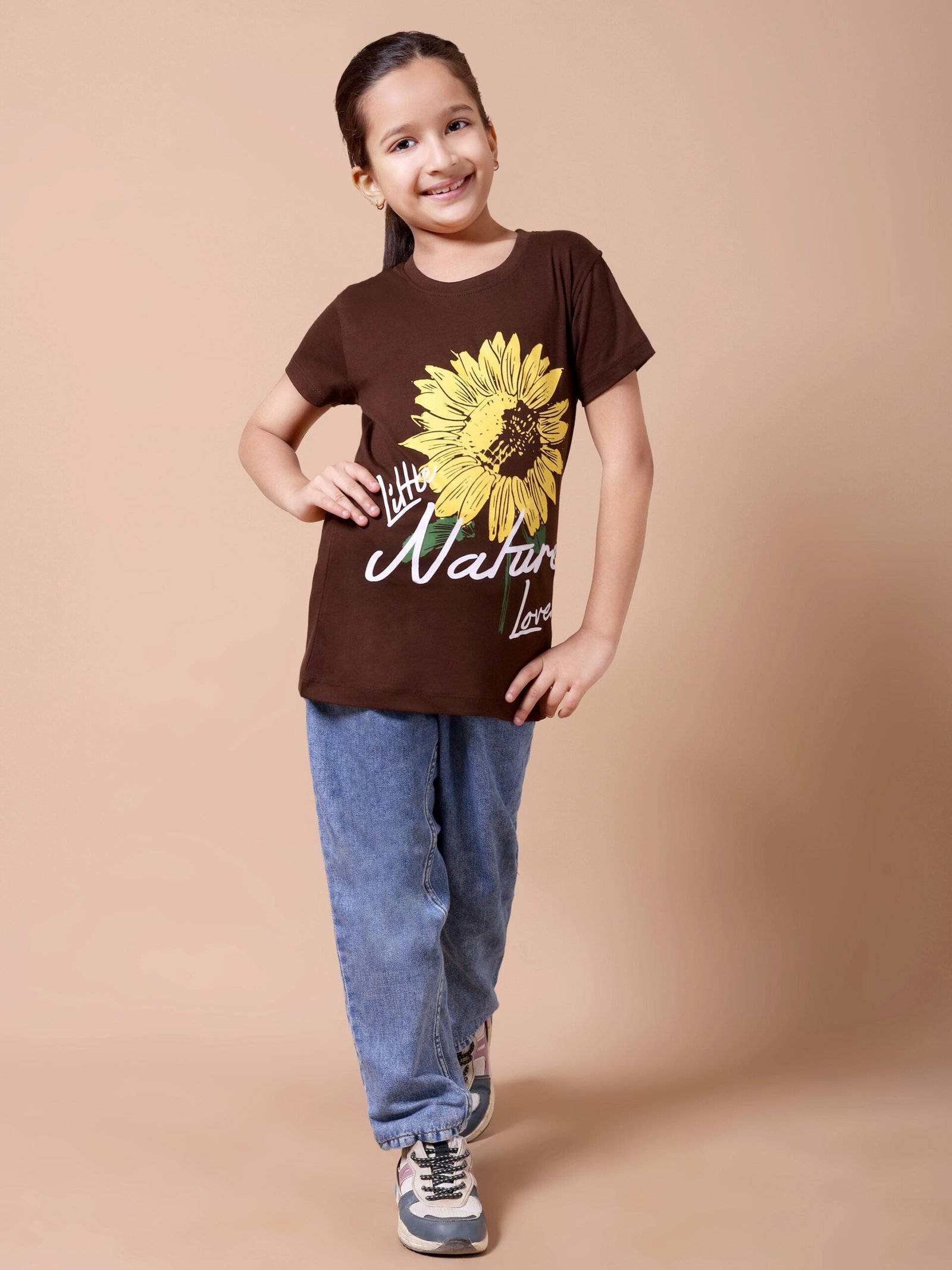 Brighten up your girl’s wardrobe with the Brown Sunflower Girls’ Printed T-Shirt. Crafted from premium 100% cotton (biowashed), this tee is soft, breathable, and gentle on the skin. The earthy brown colour paired with a vibrant sunflower chest print creates a fresh, cheerful look that’s perfect for playdates, outings, or daily wear.
