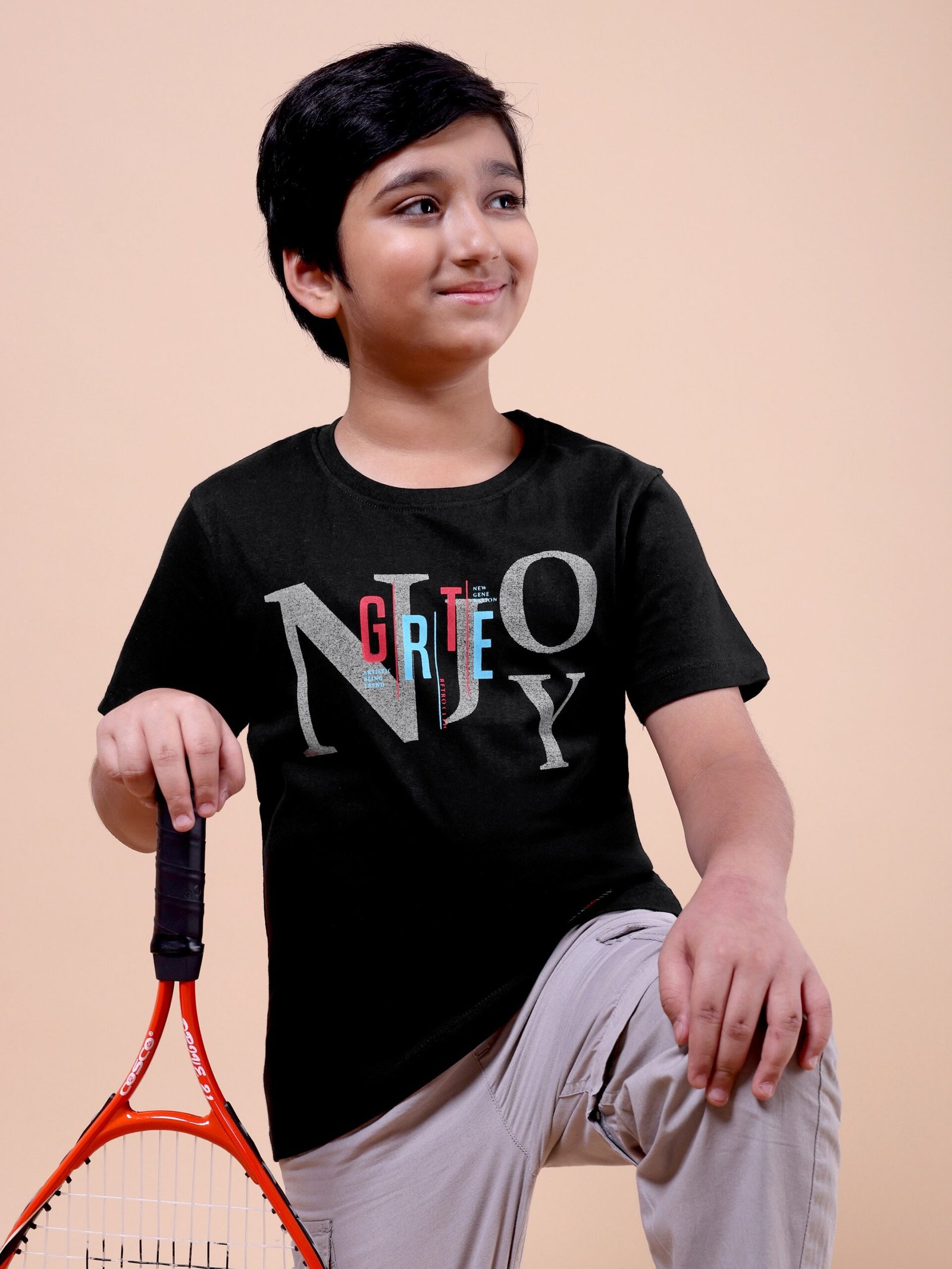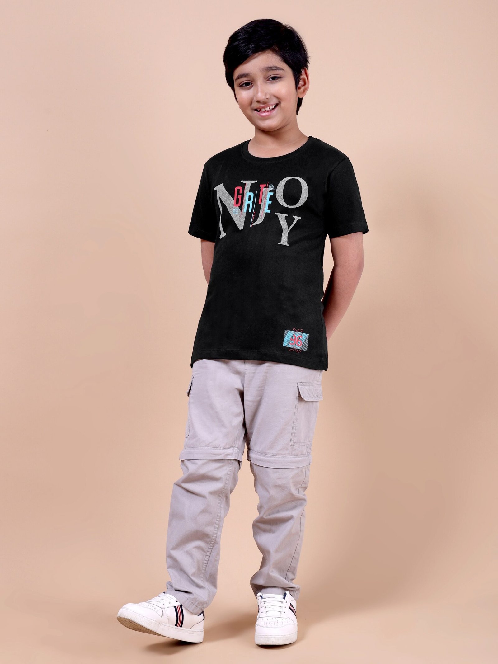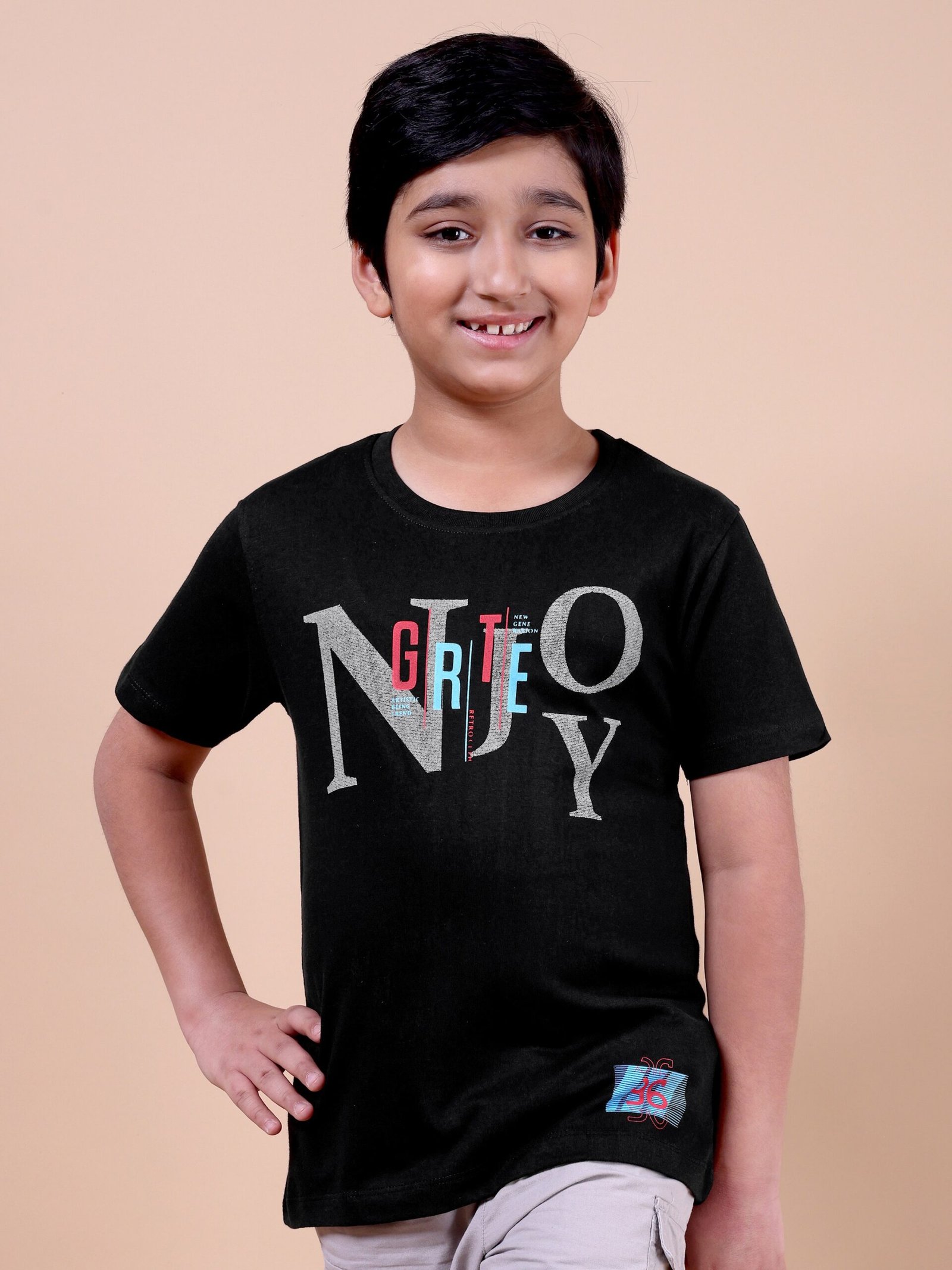 The Classic Black Enjoy T-Shirt is a must-have for boys who love timeless fashion with a playful edge.