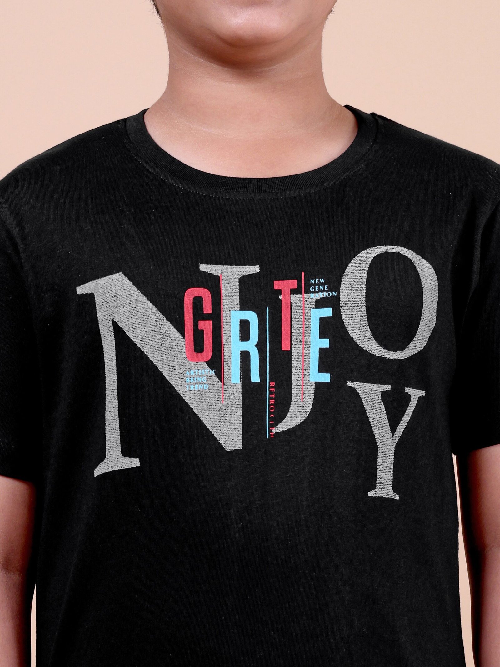 Its classic black colour makes it a versatile wardrobe staple, while the bold Enjoy graphic chest print adds a fun, youthful touch. Designed with a crew neckline and a relaxed fit, this piece pairs effortlessly with jeans, joggers, or shorts for a stylish everyday look.