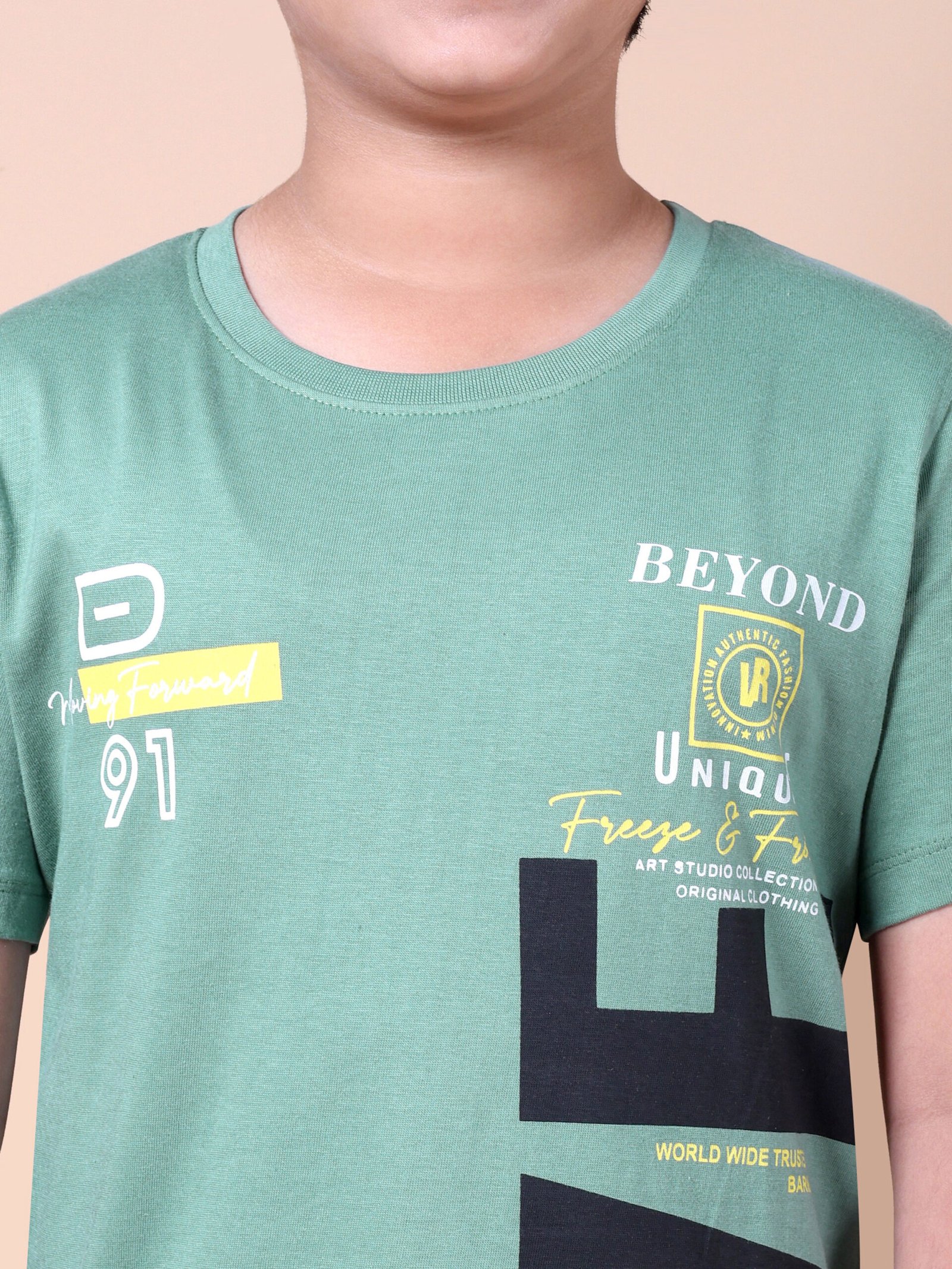 The vibrant green base is enhanced with a bold Beyond-themed chest print, giving it a modern and trendy look. Designed with a crew neckline and a relaxed fit, this t-shirt is versatile enough to pair with jeans, joggers, or shorts for a stylish casual outfit.