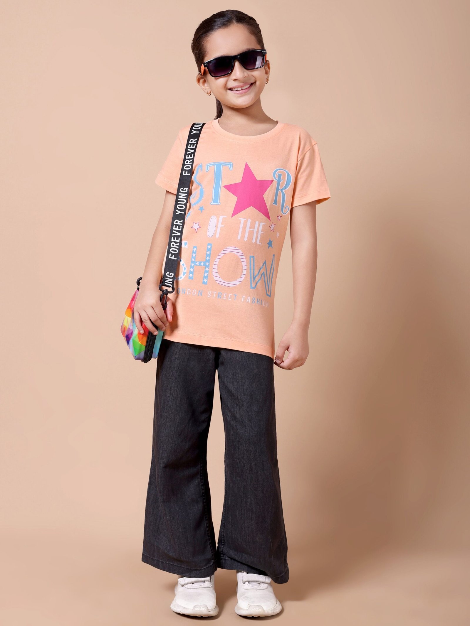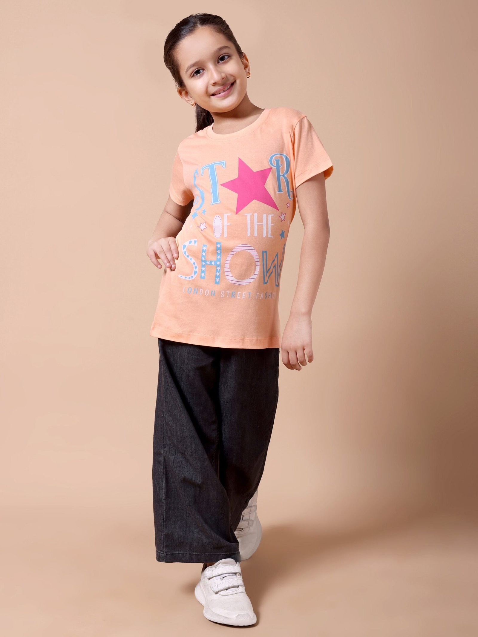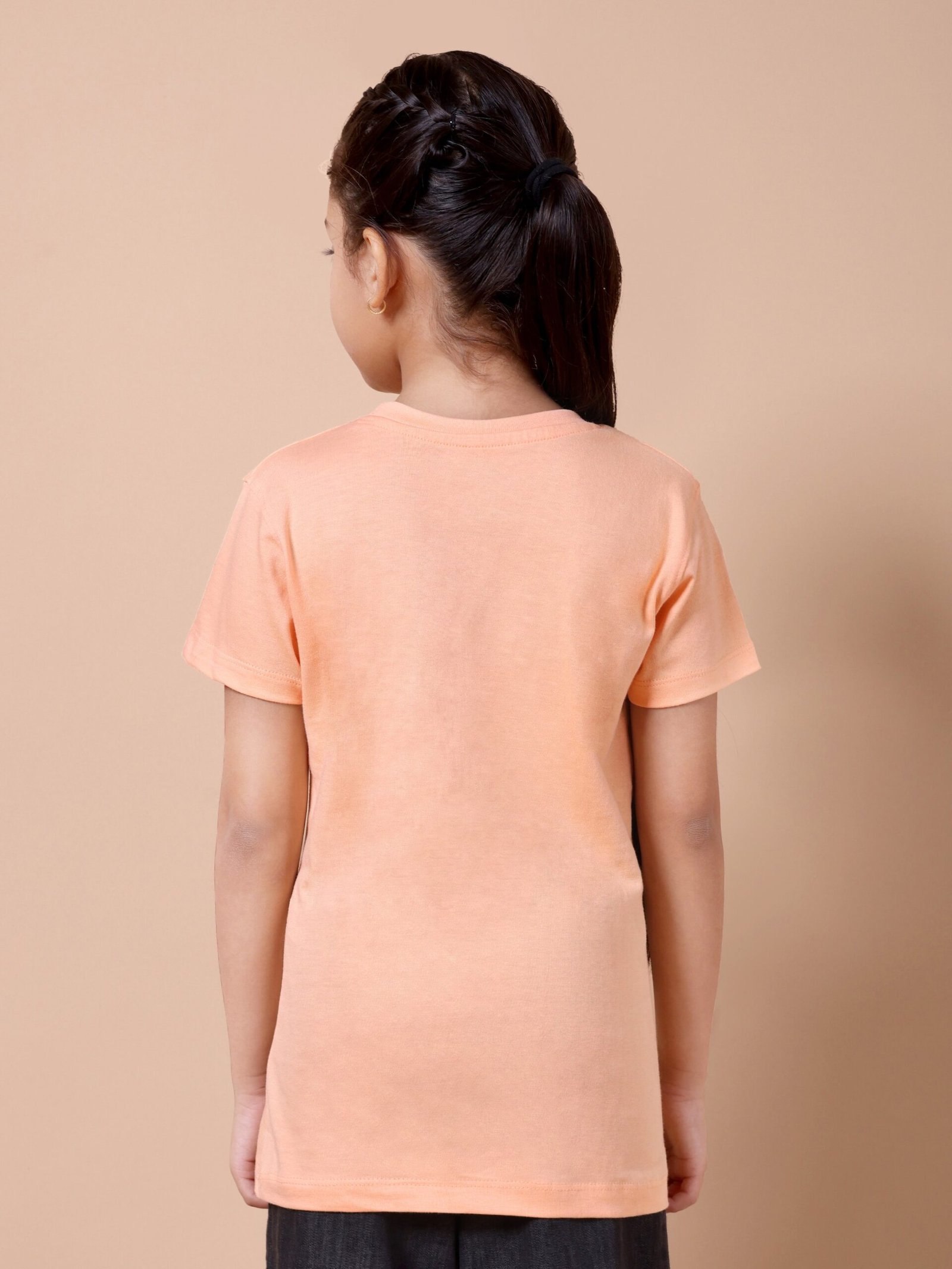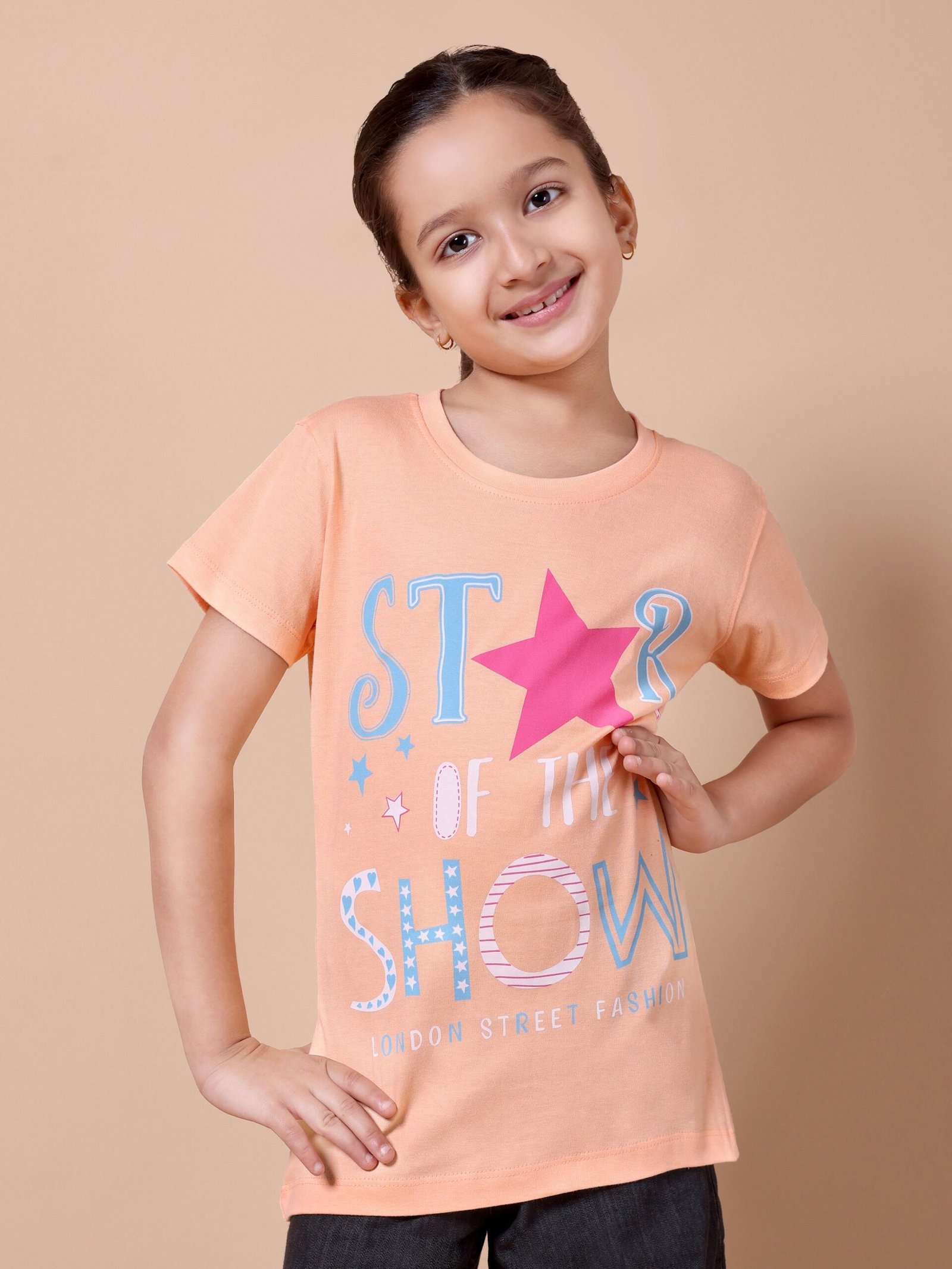 Bring comfort and sparkle to your girl’s everyday wardrobe with the Peach Star Girls’ Printed T-Shirt. Crafted from premium 100% cotton (biowashed), it is lightweight, breathable, and gentle on the skin. The warm peach colour paired with a chic star chest print adds a stylish, playful touch, making it ideal for school, playdates, or casual outings.
