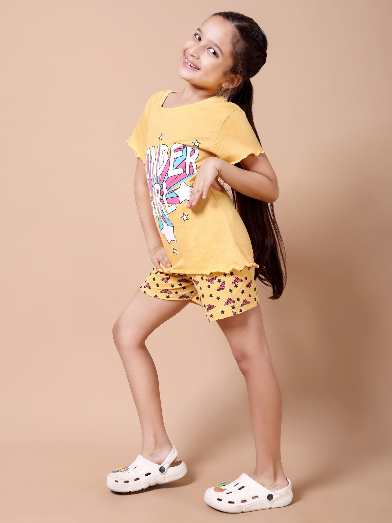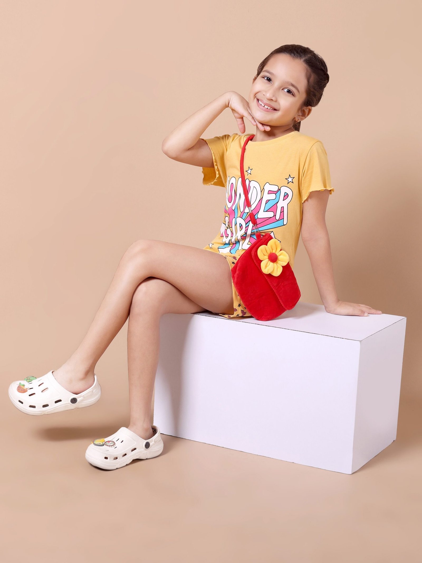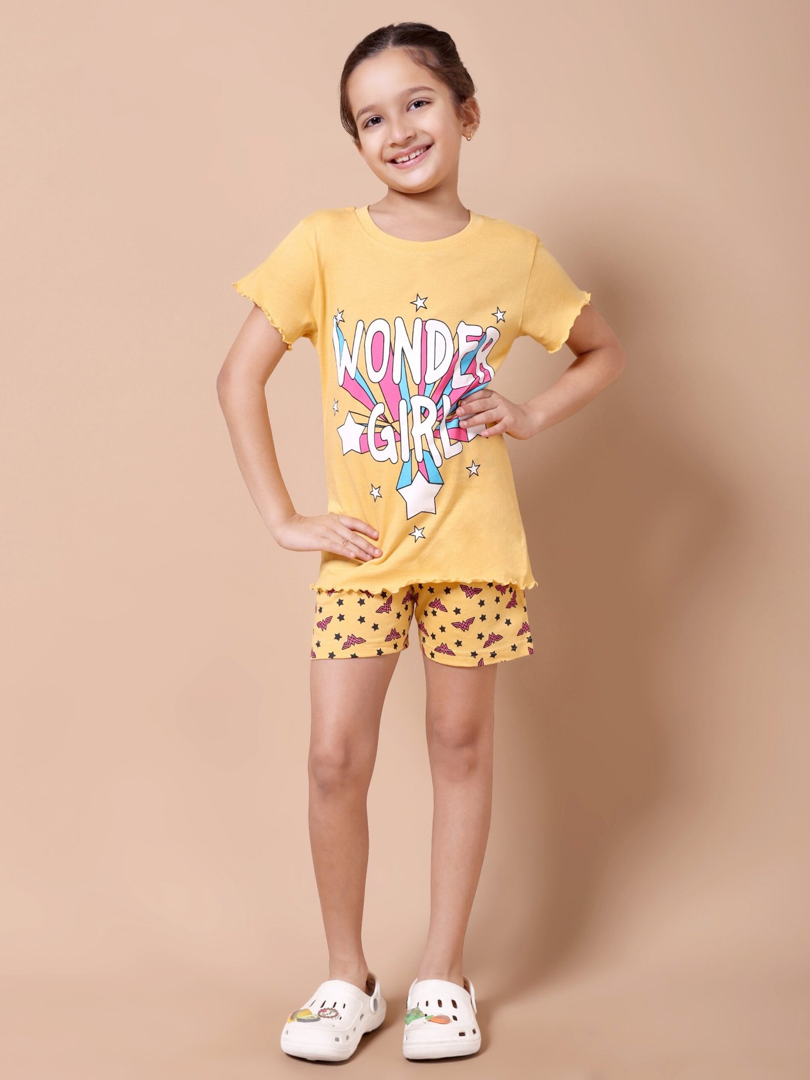 Bright, bold, and full of energy — our Samoan Sun Yellow Wonder Girl Print Girls’ Co-ord Set is made to inspire confidence in your little one. This fun two-piece outfit includes a short-sleeve top with a colorful “Wonder Girl” slogan and starburst print, paired with matching shorts decorated with playful star motifs. Crafted from soft and breathable cotton, this co-ord set ensures comfort while adding a vibrant pop of style. Perfect for casual outings, playdates, or everyday wear, it’s designed for little trendsetters who love to shine.